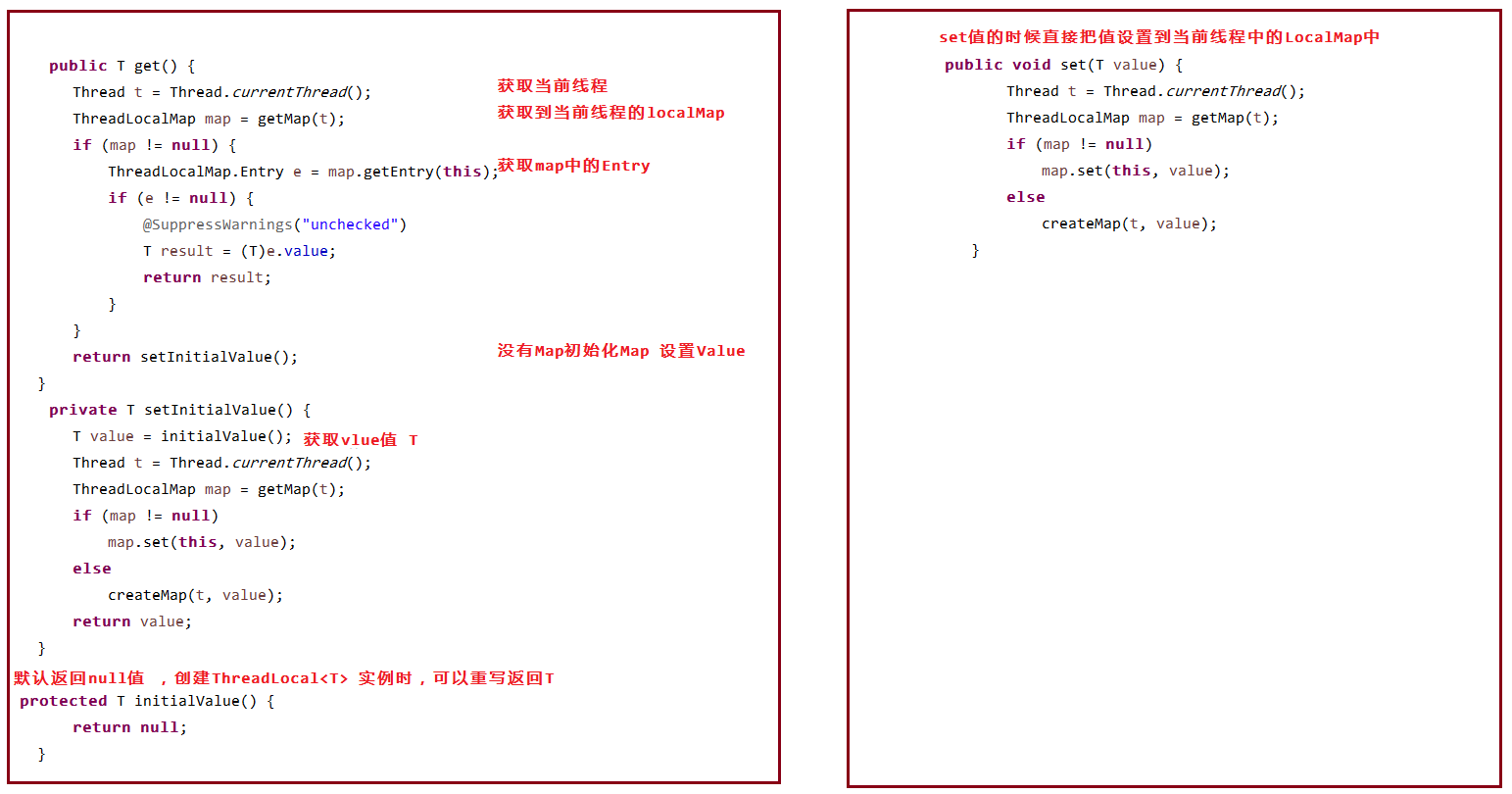 原来在get获取对象T的时候 ,如果原先没有set值进去 ,执行initialValu方法,并把值设置到当前线程持有对象ThreadLocalMap中。