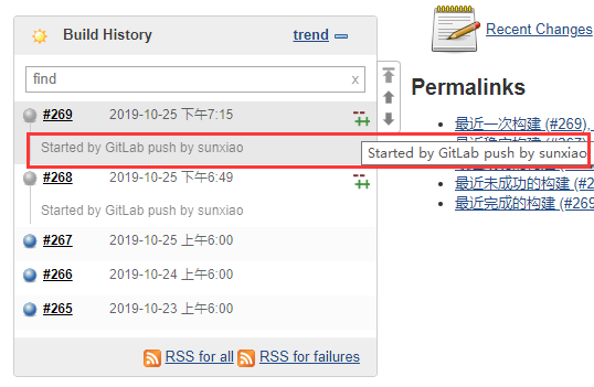 登录Jenkins任务界面,查看该任务是否真的远程触发。如果安装了Build Trigger Badge插件,可以在每个构建处看到被触发的原因。比如,#269就是被远程GitLab主机的Master分支提交触发的任务,如下图所示: