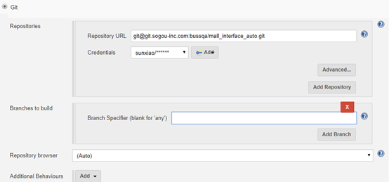 配置Git分支。分支可以在下面触发器的GitLab触发部分进行配置,所以在Git源码管理部分,分支为空即可,即默认任何有代码变动的分支都会拉取。