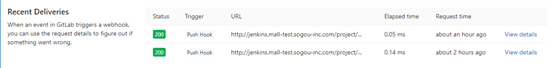点击GitLab Webhook中的Edit按钮,拉到最下方,可以看到该Webhook URL的所有触发记录,点击右边的View details按钮还可以查看触发的详情,如下图所示: