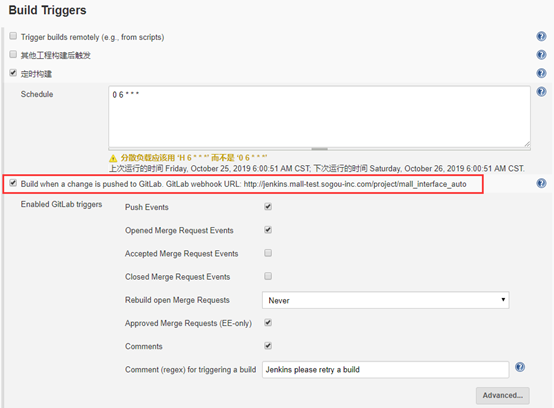 Enable GitLab triggers :默认打开代码提交,创建新的合并请求,让合并请求通过,添加注释等,也可以根据实际需求增加或减少。