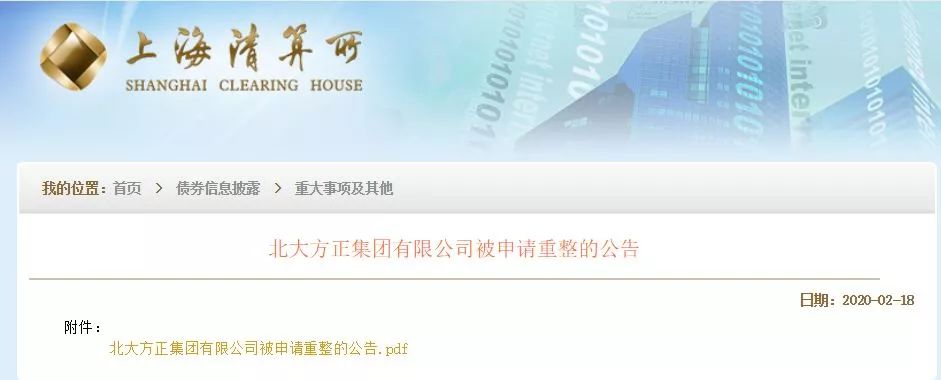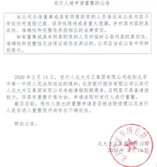 另据方正集团18日在上海清算所披露的公告,方正集团是在2月14日收到了北京市第一中级人民法院送达的通知,北京银行向法院申请对方正集团进行重整的理由为, 方正集团未能清偿到期债务,且明显不具备清偿能力,但具有重整价值。