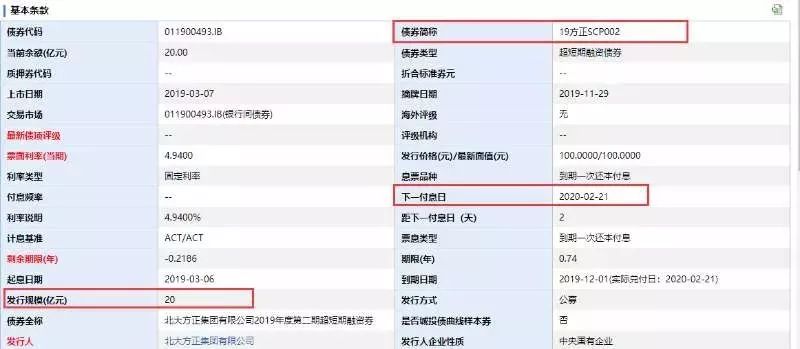 2019年12月23日方正集团公告,方正集团在2019年12月23日支付“19方正SCP002”原存续期间的应计利息。至于本金部分,债券持有人会议表决决定展期两月,将“19方正SCP002”本金兑付日变更为2020年2月21日,也就是本周五,期间利息按照原利率4.94%计息。
