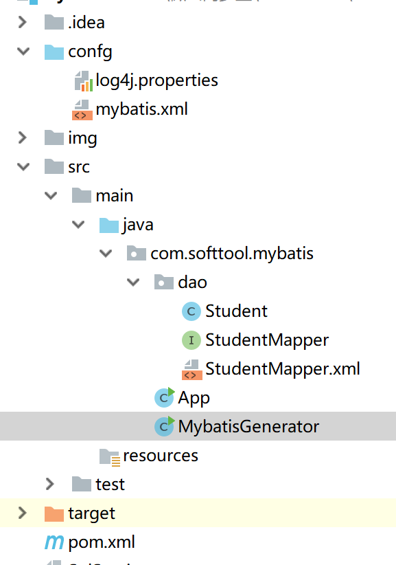 为了看清楚MyBatis的整个初始化过程,先创建一个简单的Java项目,目录结构如下图所示: