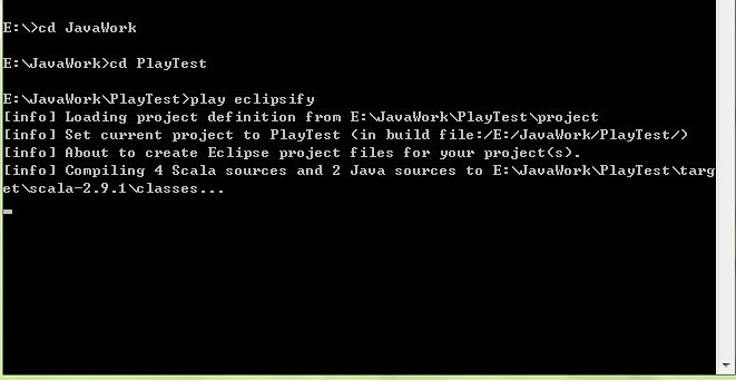 2 切换到刚建立的工程(PlayTest)目录下,输入play eclipsify,表示要生成能导入eclipse的框架工程,回车等待程序运行完毕。