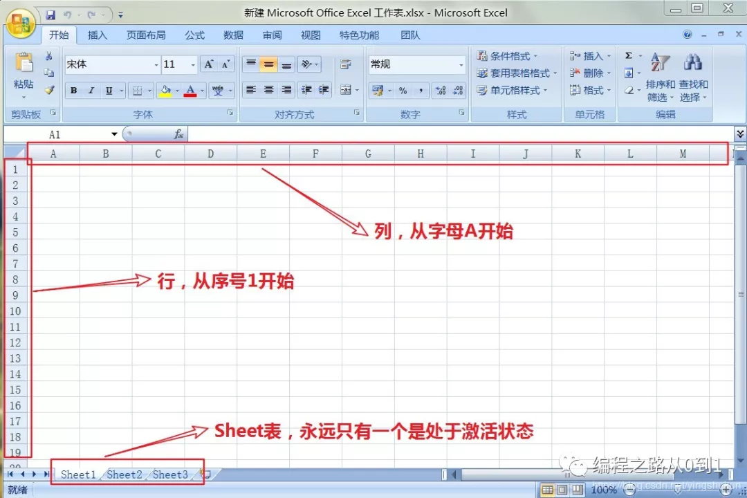 先让我们认识一下Excel的一些概念,有助于我们理解代码,这里主要是三个概念,行、列和Sheet表。如下图