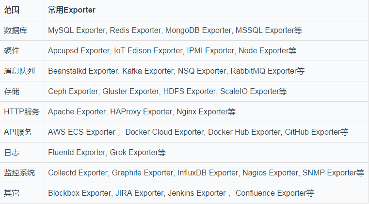 Prometheus社区提供了丰富的Exporter实现,涵盖了从基础设施,中间件以及网络等各个方面的监控功能。这些Exporter可以实现大部分通用的监控需求。下表列举一些社区中常用的Exporter: