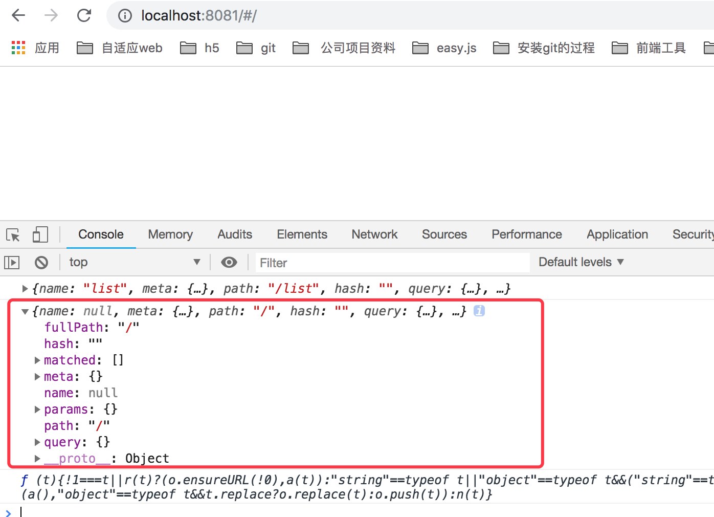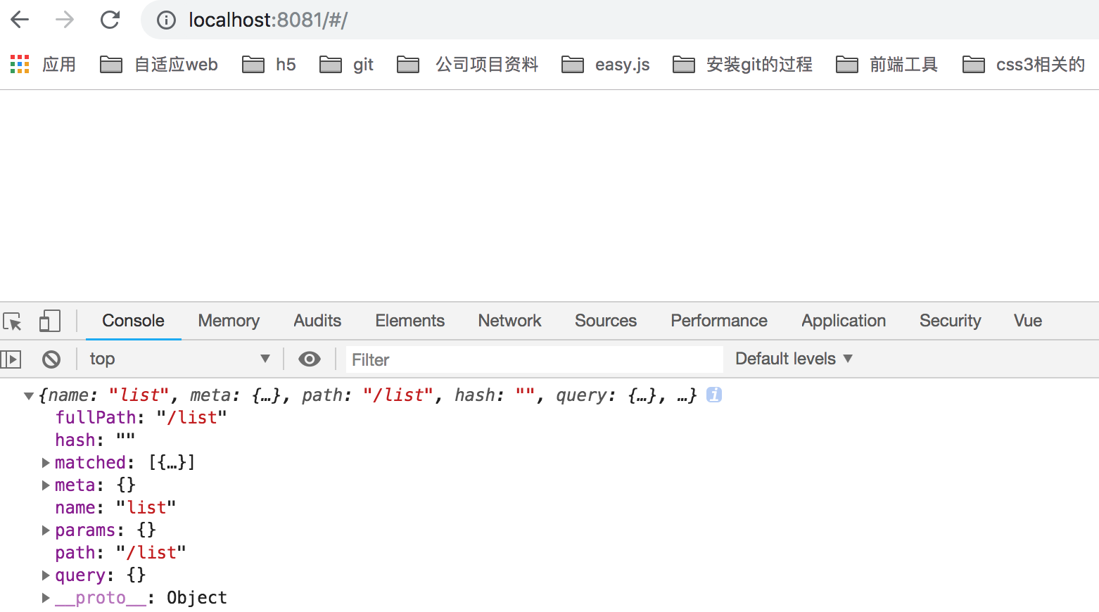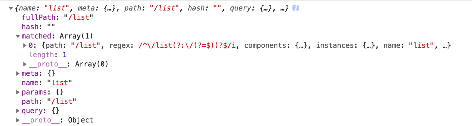 next(false); 如果next方法添加一个false的话,那么就会中断当前的导航跳转。修改完成后,我们重新刷新 localhost:8081/list 这个页面的话,会看到页面一片空白,最后我们打印下 console.log(to); 的信息如下: