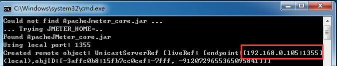 2、启动执行机上的Jmeter-server.bat,如下图,端口号已经修改为:1355