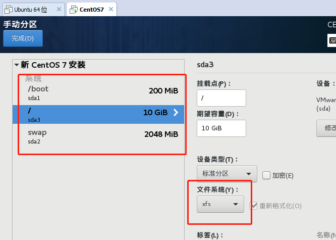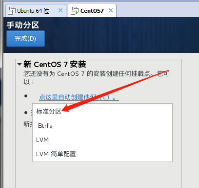 设备类型选择默认的标准分区,文件系统类型为xfs,Centos7支持brtfs,生产环境不建议选择,btrfs文件系统目前技术尚未成熟,只是作为一种前瞻技术。