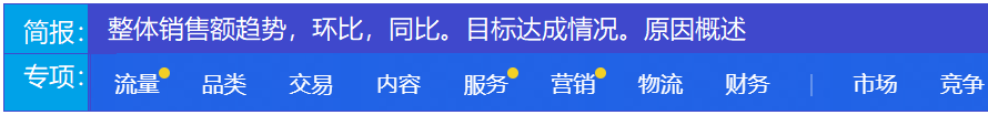 简报+市场+交易+商品总览(SKU、动销率等)+销售集中度+主打商品的单个数据变化