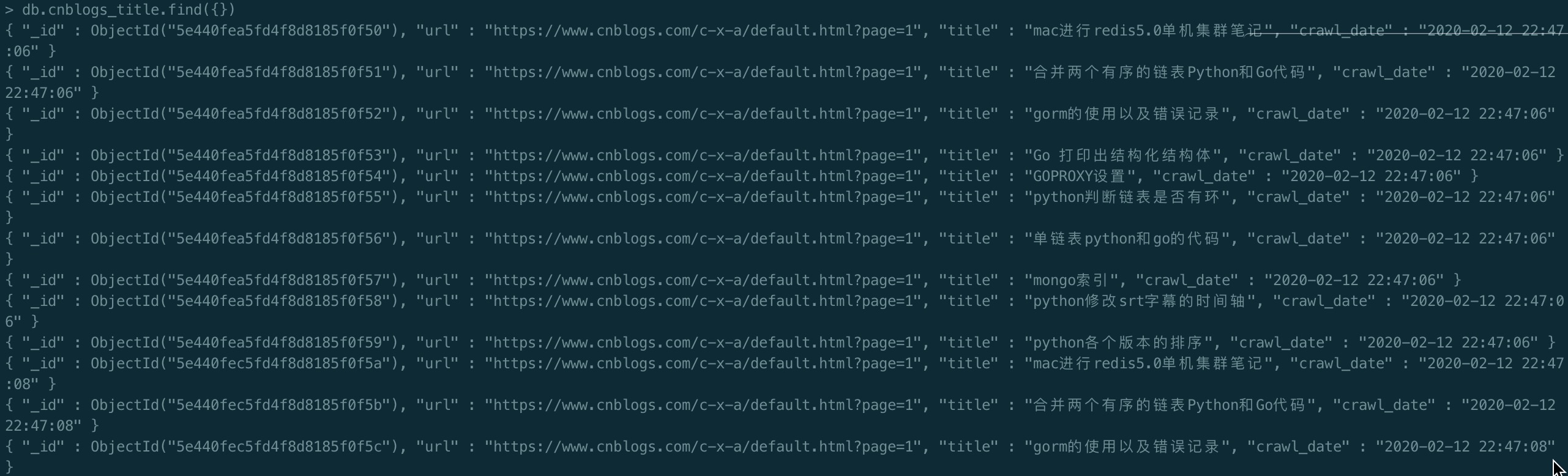 第二处,查看mongo数据库,发现我们成功保存了结果。