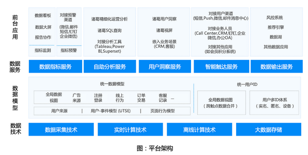- 可扩展性原则:为了适应业务以及用户行为的多样性,采用了先进的UTSE(用户、触点、会话、事件)模型作为系统核心的数据模型,并通过数据字典和元数据管理满足当前以及未来用户行为数据化及业务需求的变化;另外,采用的系统组件均具备非常好的横向扩展能力,可以通过增加或调整设备资源的方式灵活应对业务的增长或变化需求;
