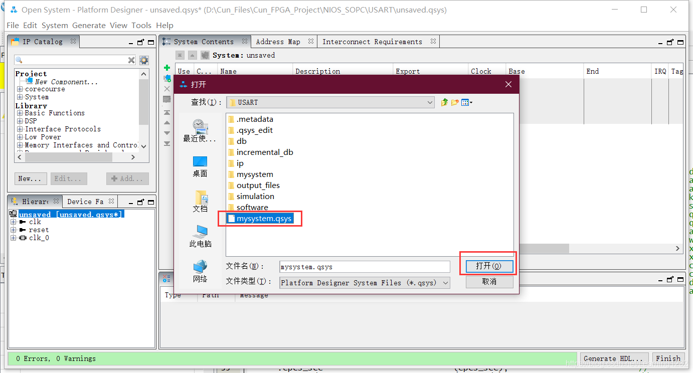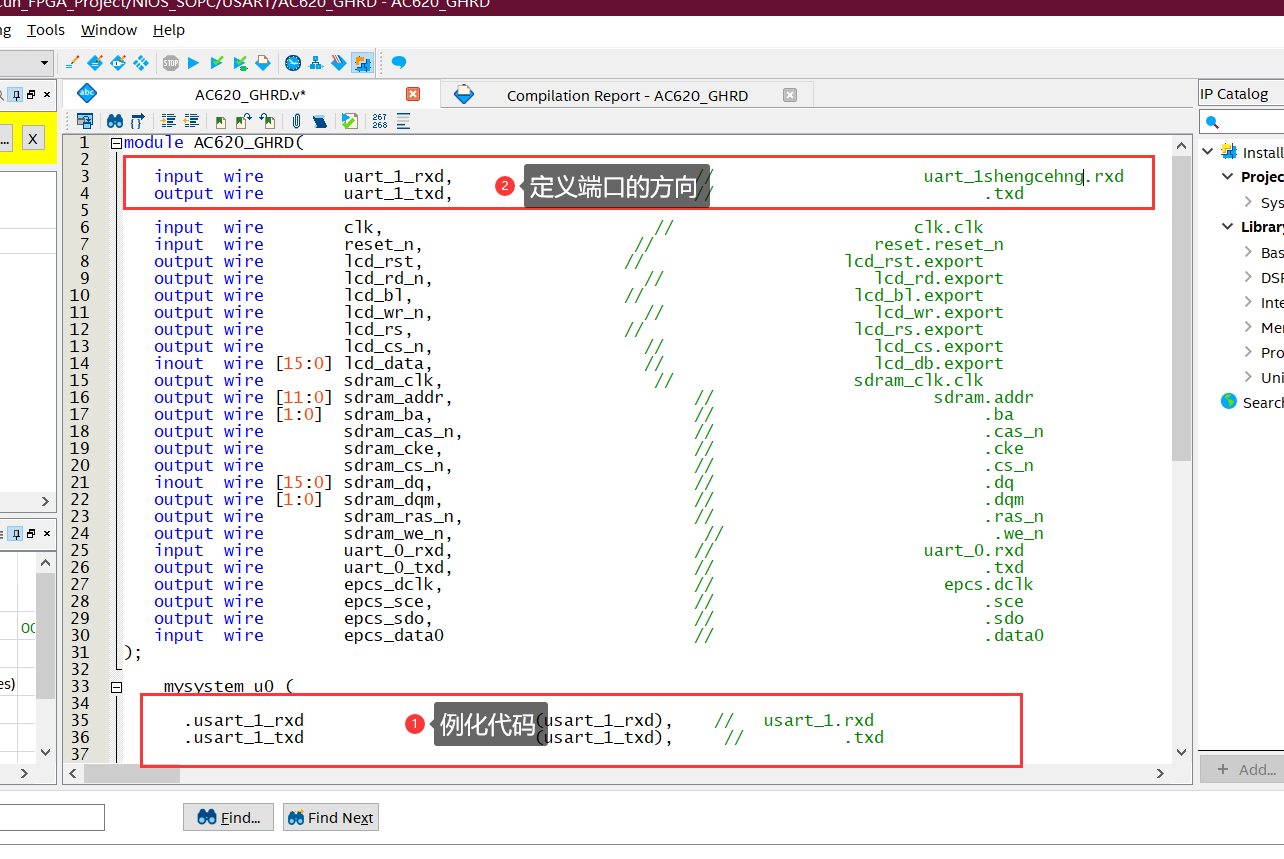 第一步、生成系统,然后复制例化代码,然后再顶层文件里面添加例化的代码,并且添加输入例化输出的串口代码。