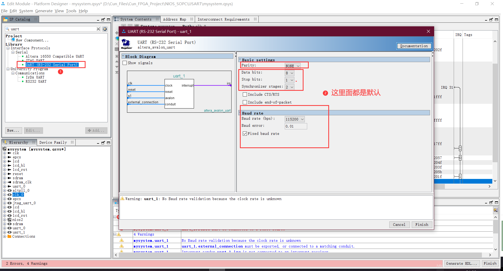 第二步、添加一个UART(RS-232 Serial Port)IP核,里面的参数默认就可以