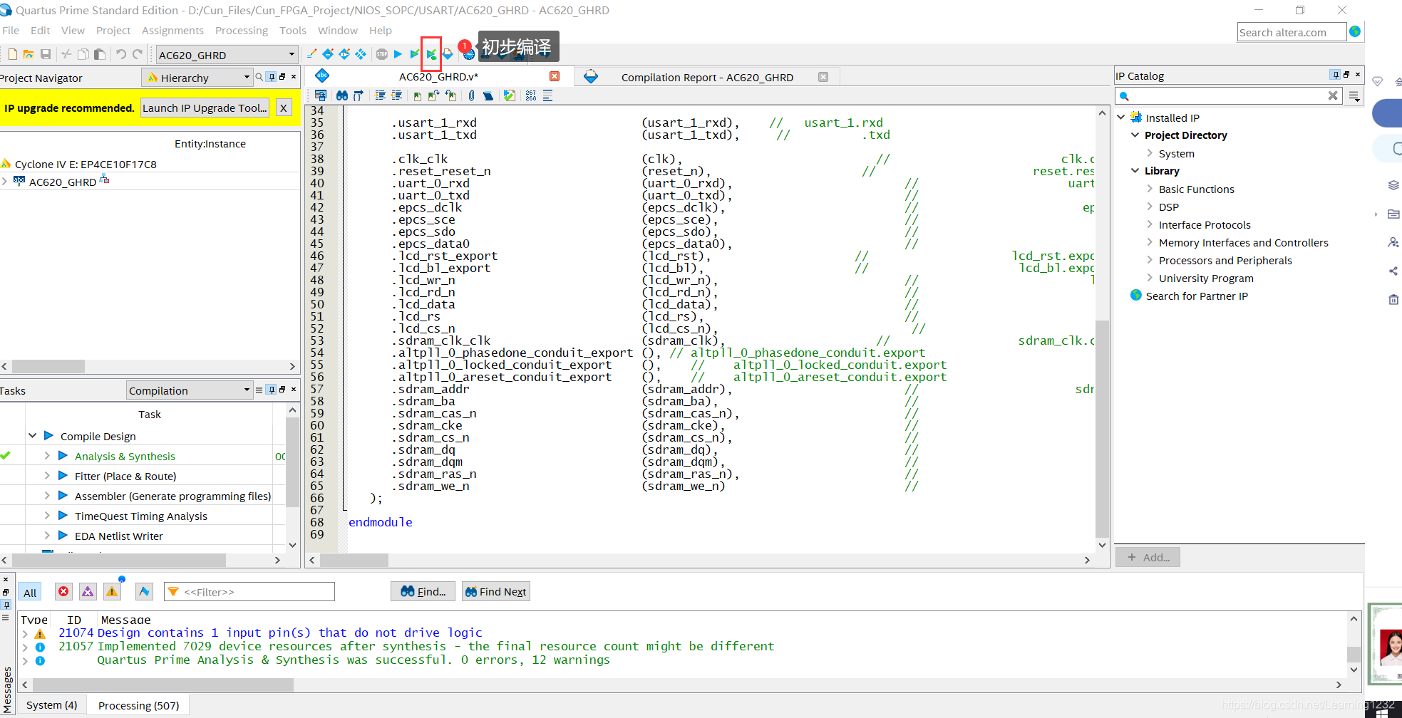 第二步、进行简单的分析和综合,也就是初步编译,我认为是为了在分配管脚的界面出现新添加的端口。