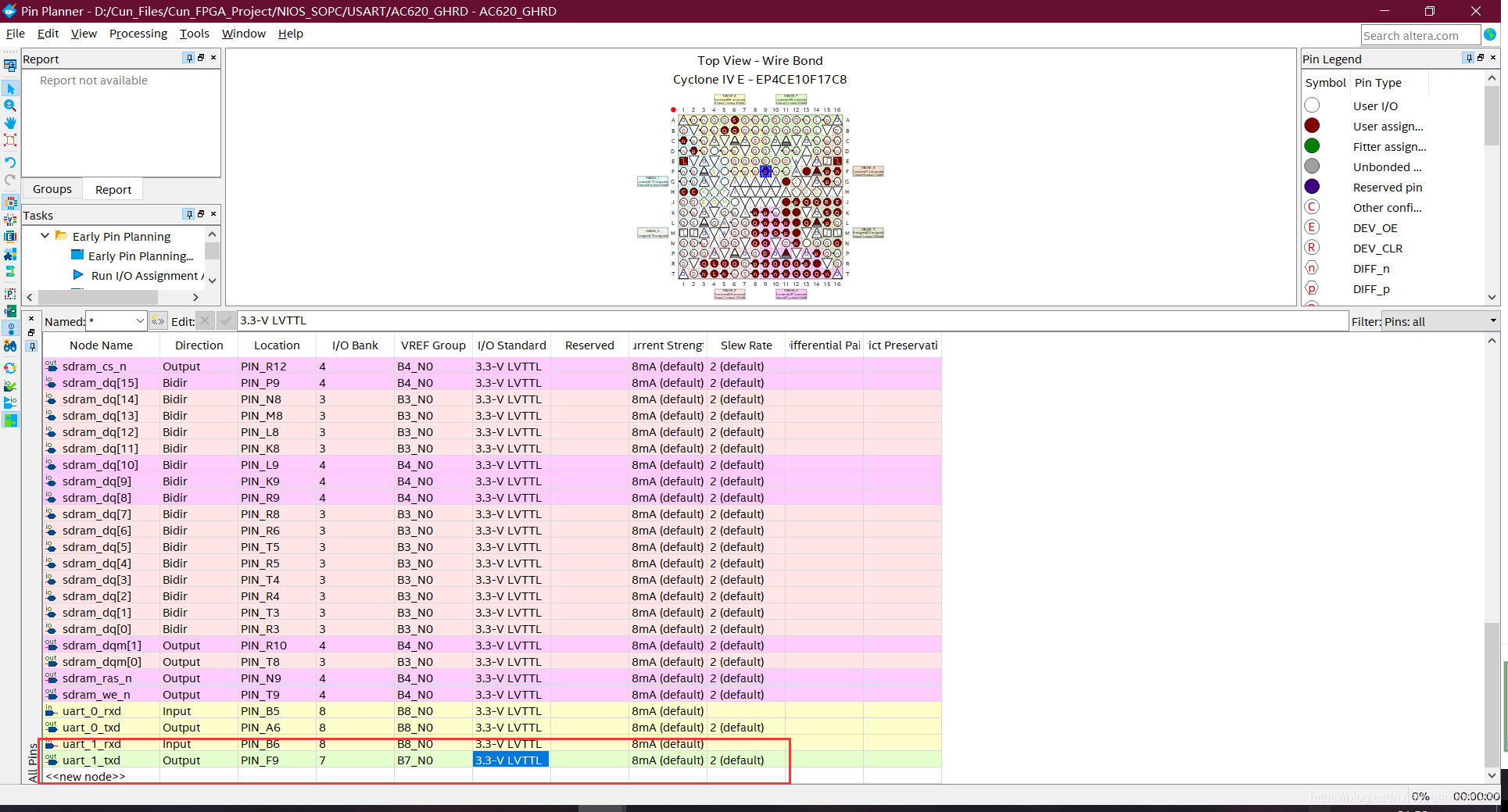 第三步、进行引脚的分配,这里我是随便选的我的FPGA上面两个裸露的IO口,(选择I/O口的要求我不知道,应该没有要求,注意:如果你的FPGA型号和我不一样,那你随便选两个你单片机上面的IO),然后进行全编译。