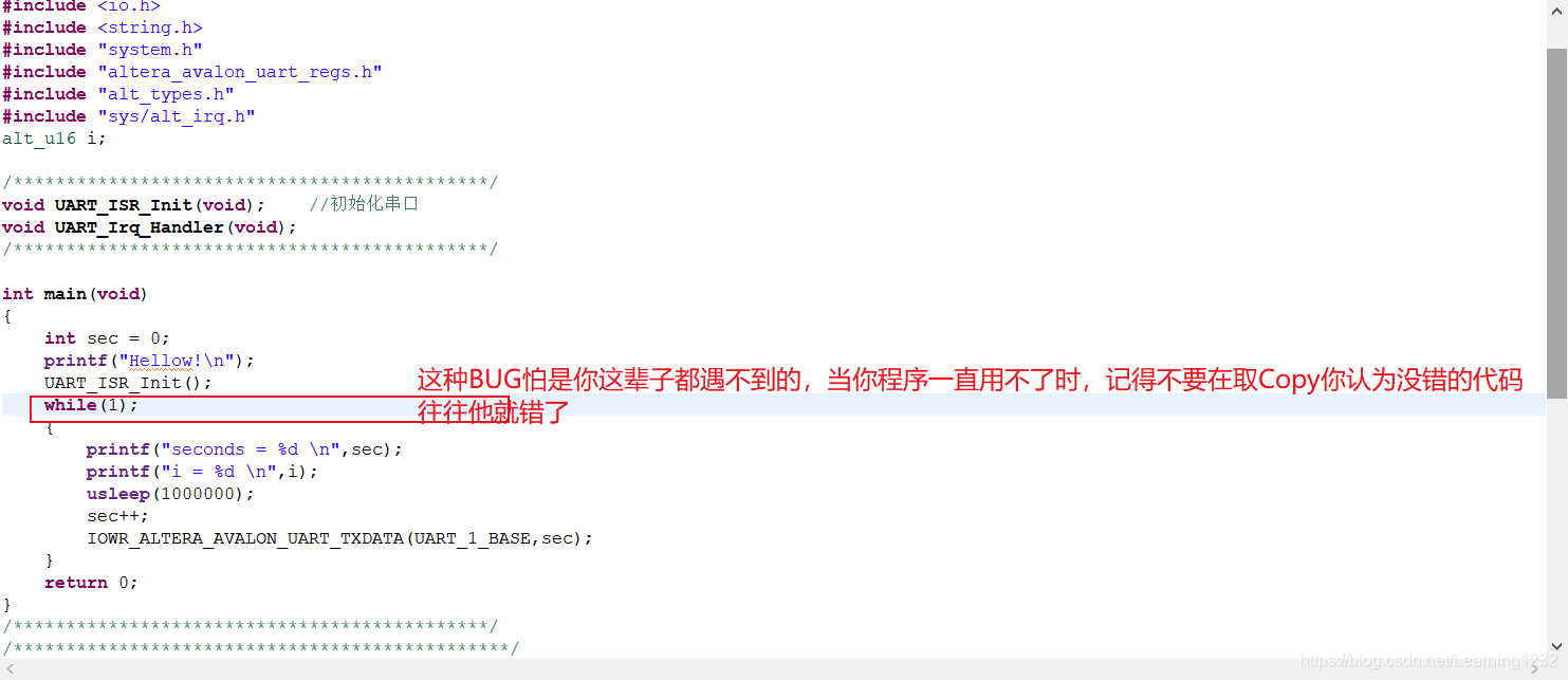 我当时给自己写的:“我人傻了、搞了好几天,遇到的一个让人苦笑不得的笑话,以后要注意,while(1)前面的程序可以执行,但是里面的执行不了,那么想一下会不会是这个问题。”