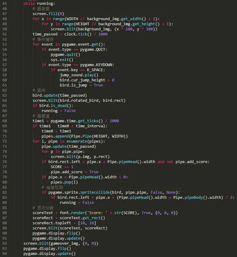 现在就可以开始定义游戏主循环了!游戏主循环的逻辑十分简单,先显示游戏背景,然后根据玩家的操作更新小鸟位置,自动更新管道位置,并通过碰撞检测以及小鸟的纵坐标来判断游戏是否结束,若游戏结束,则显示游戏结束画面。当然你也需要根据玩家通过的管道数量来实时更新玩家当前的分数,这一步需写在最后,否则分数会被管道所遮盖,这显然是不合理的,具体实现如下: