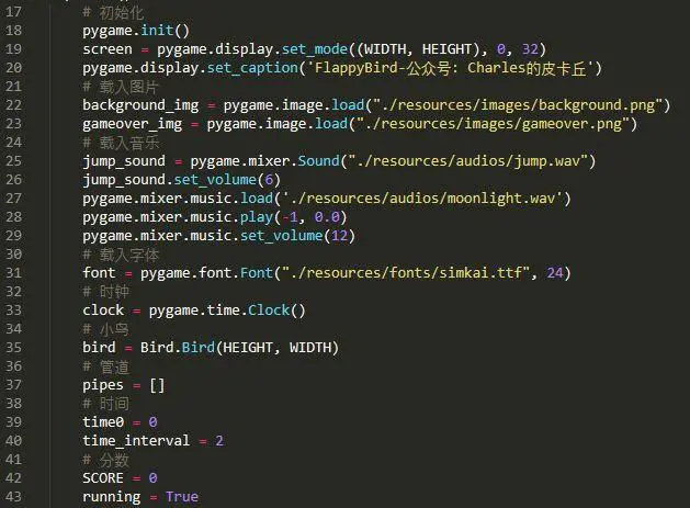 先初始化,载入图片、音乐、字体等文件,并定义一些必要的常量: