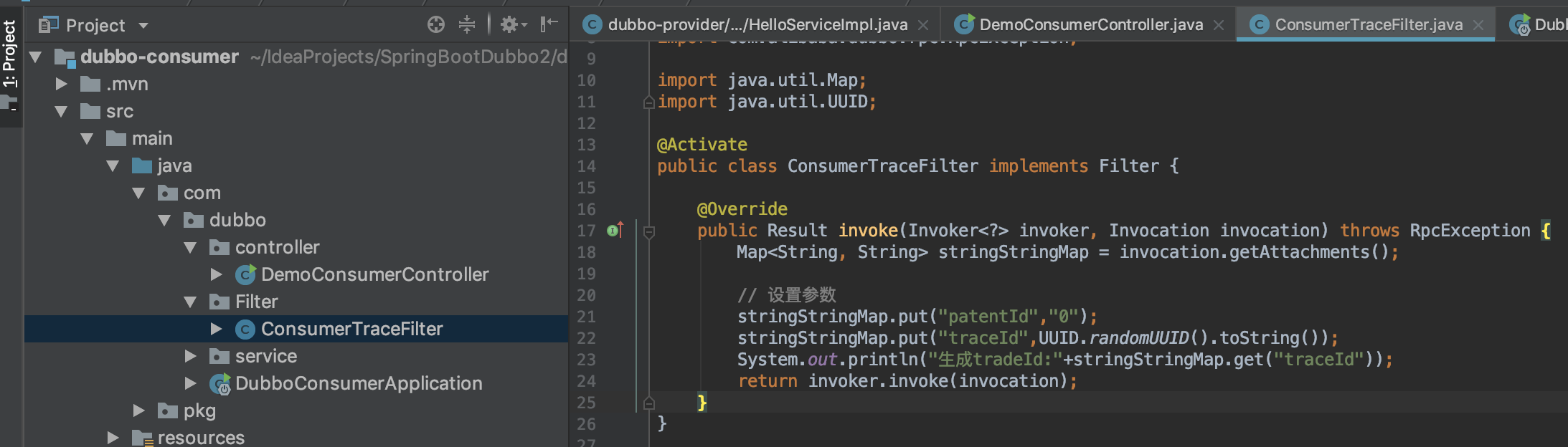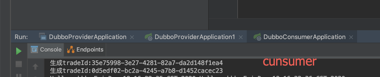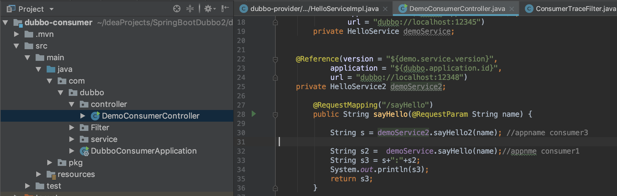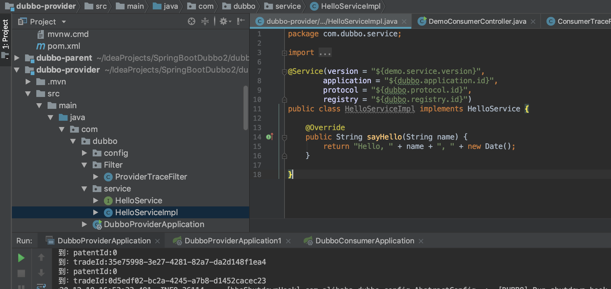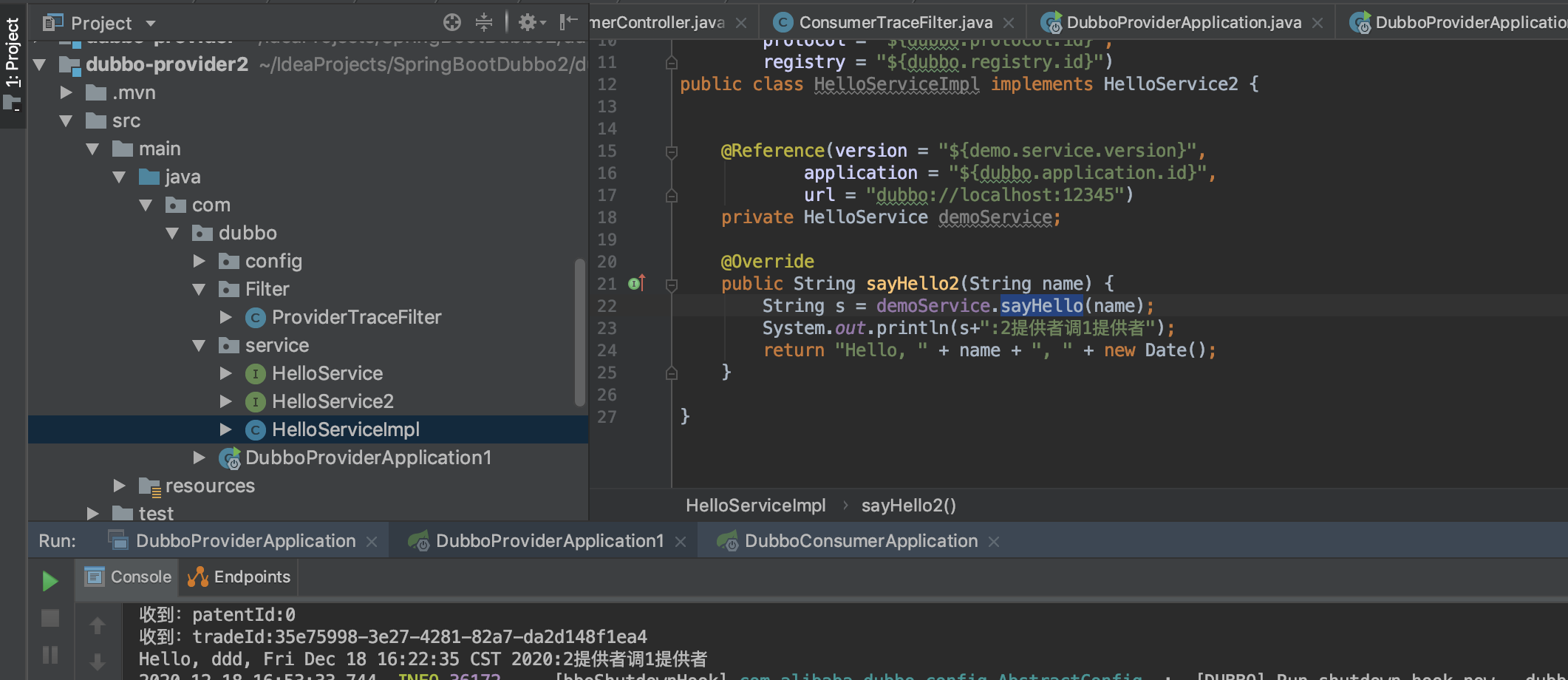 代码 :springboot+dubbo 先启动dubbo-provider 后、再启动dubbo-provider2 后、再启动dubbo-consumer 访问:http://localhost:8080/sayHello?name=ddd