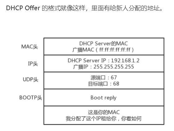 DHCP Server发现了这个新人的广播包后会再通过广播包给新人分配一个ip地址,这个过程叫DHCP Offer。