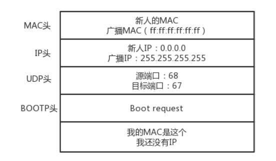 新加入的机器使用IP地址0.0.0.0发送一个广播包,目标ip是255.255.255.255,MAC层包头内有自己的MAC地址,UDP协议,下层是BOOTP协议,而DHCP其实是BOOTP的增强版。