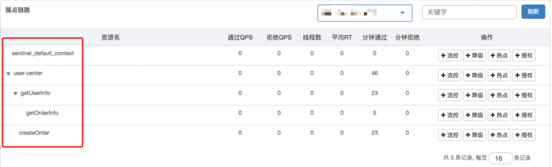 context,线程执行的上下文,在 Sentinel 中对于一个新的 context name,Sentinel 会往树中添加一个 EntranceNode 实例。所以它的作用是为了区分调用链路,标识调用入口。在 sentinel-dashboard 中,我们可以很直观地看出调用链路: