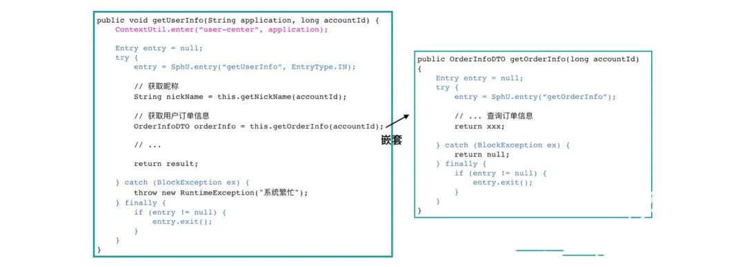 若在一个方法中写,要注意内层的 Entry 先 exit,才能做外层的 exit,否则会抛出异常。源码角度来看,是在 Context 实例中,保存了当前的 Entry 实例。