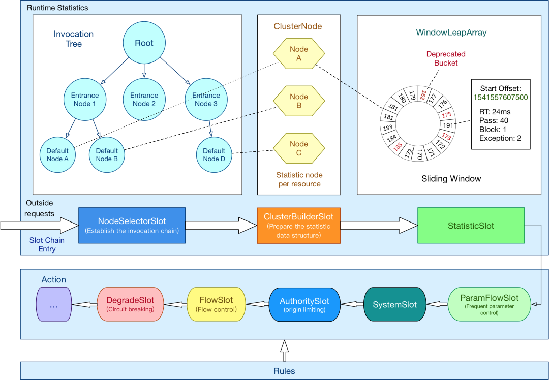 Sentinel 的核心将不同 Slot 按序串在一起(责任链模式),从而将不同功能(限流、降级、系统保护)组合在一起。核心结构:
