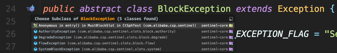 进入 BlockException 异常分支,代表该次请求被流量控制规则限制,一般会让代码走入到熔断降级逻辑。当然,BlockException 其实有好多个子类