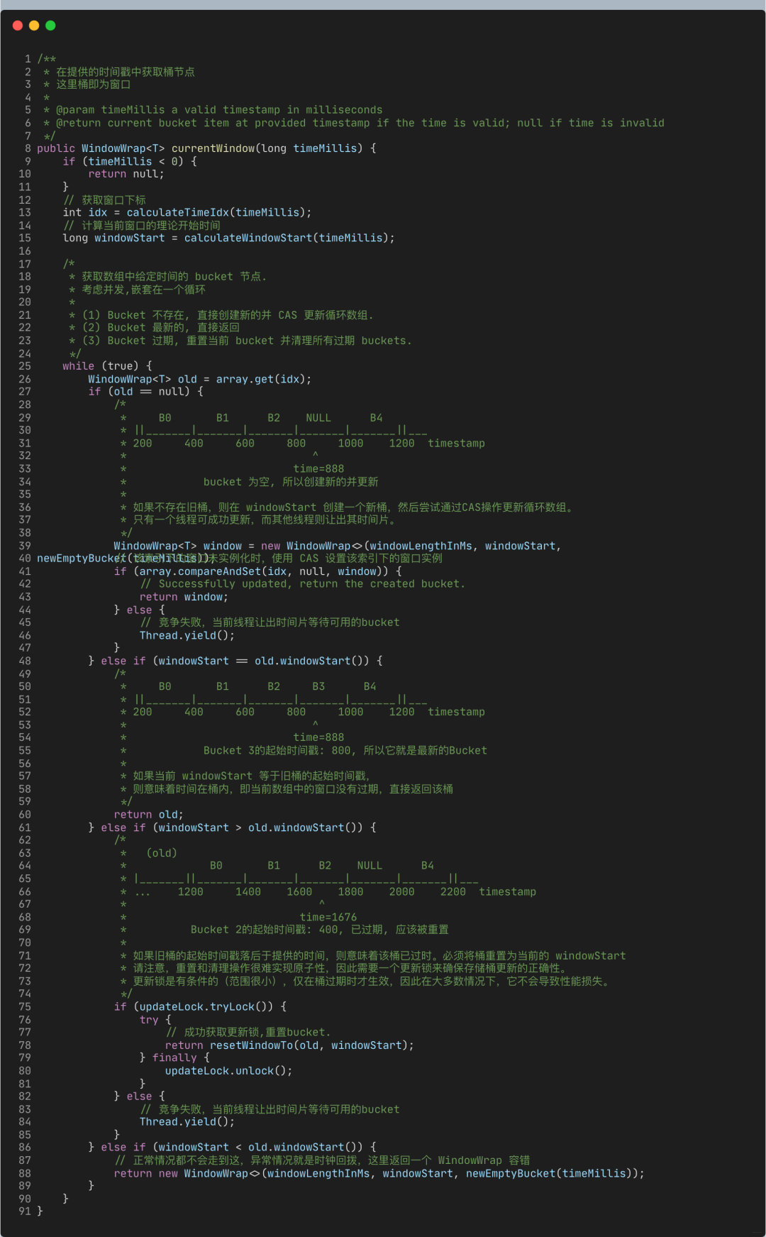 核心逻辑都封装在了 currentWindow(long timeMillis) 和 values(long timeMillis)方法中。