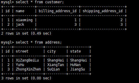 首先我们创建两个表customer和address两个表,其中customer表中有address的两个外键: