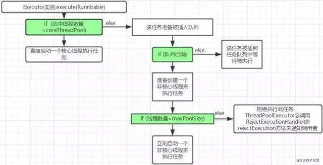 在创建了线程池后,默认情况下,线程池中并没有任何线程,而是等待有任务到来才创建线程去执行任务,除非调用了 prestartAllCoreThreads() 或者 prestartCoreThread() 方法,从这两个方法的名字就可以看出,是预创建线程的意思,即在没有任务到来之前就创建 corePoolSize 个线程或者一个线程。默认情况下,在创建了线程池后,线程池中的线程数为0,当有任务来之后,就会创建一个线程去执行任务,当线程池中的线程数目达到 corePoolSize 后,就会把到达的任务放到缓存队列当中。