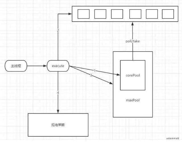 在任务队列满了之后 corePool 还没有空闲,那么任务将被提交到 maxPool 中,如果 MaxPool 满了之后执行 task 拒绝策略。