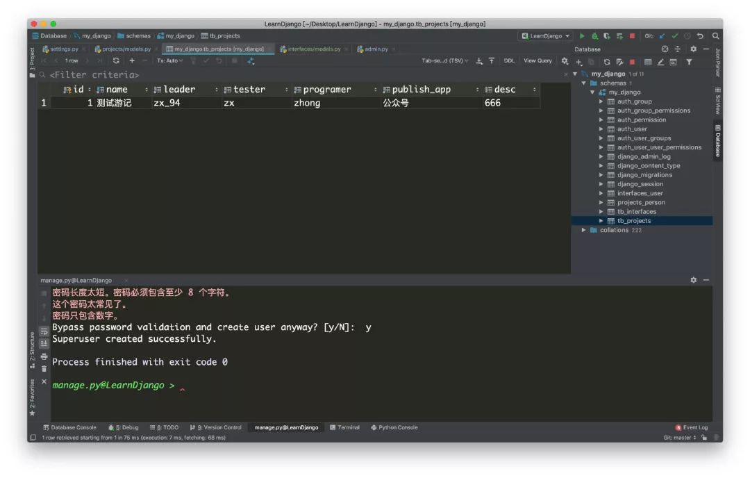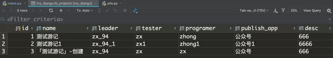 one_obj = Projects(name='「测试游记」-创建', leader='zx_94', tester='zx', programer='zx', publish_app='公众号', desc='666')