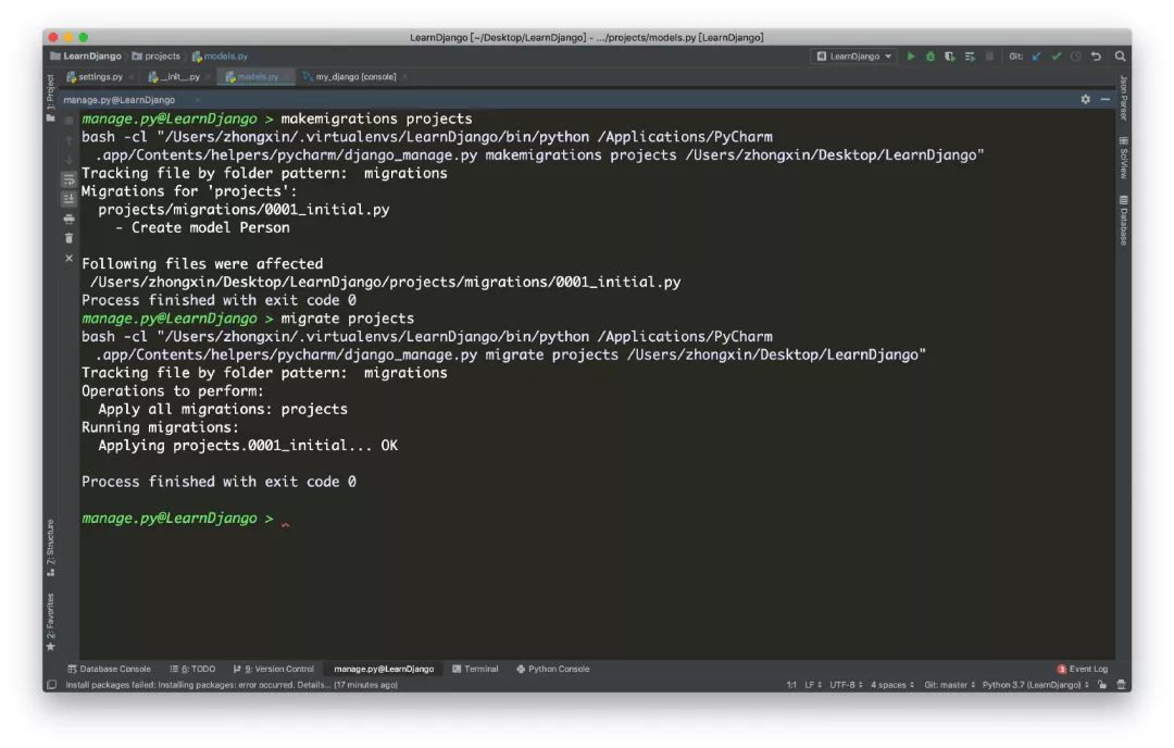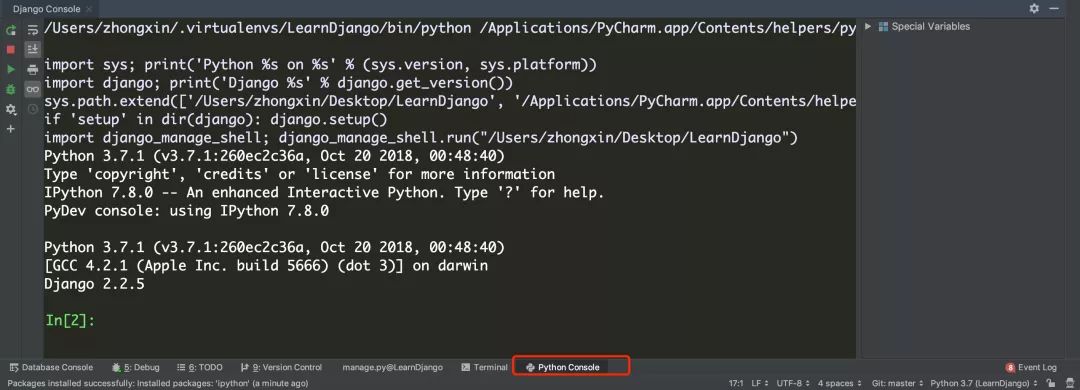 使用Pycharm自带的 PythonConsole就可以进入Django的shell模式