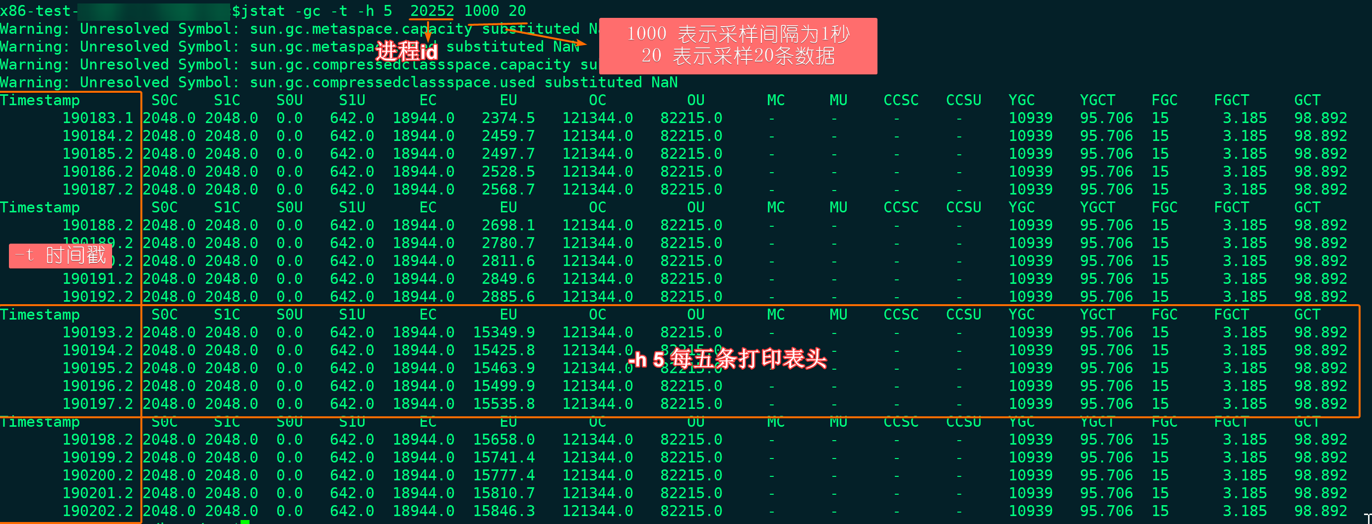 -option必选参数表示命令参数 如gc等,-t为可选参数表示是否打印时间(秒),-h<lines>可选参数,表示每隔多少行打印头部列表,如设置-h 5, 那么每五条记录就会重新打印表头,vmid必选参数,Java进程id,interval可选参数表示采样的时间间隔,count可选参数表示需要采样多少条,