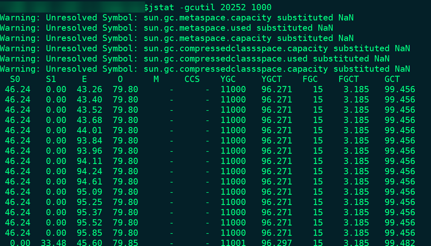 S0C: 新生代中第一个Survivor(即From区)的容量大小 (千字节)S1C: 新生代中第二个Survivor(即To区)的容量大小 (千字节)S0U: 新生代From Survivor区已使用内存大小(千字节)S1U: 新生代To Survivor区一使用内存大小(千字节)EC: 新生代Eden区的容量大小(千字节)EU: 新生代Eden区已使用内存大小(千字节)OC: 老年代空间容量大小(千字节)OU: 老年代已使用内存大小(千字节)MC: 方法区的空间大小 (千字节)MU: 方法区已使用的空间大小(千字节)YGC: 从系统启动到现在Young GC/Minor GC的次数YGCT:Young GC总耗时(秒)FGC:从系统启动到现在Full GC的次数FGCT:Full GC的总耗时(秒)GCT: 垃圾回收总的耗时(秒)NGCMN:年轻代(young)中初始化(最小)的大小 (千字节)NGCMX:年轻代(young)的最大容量 (千字节)GC:年轻代(young)中当前的容量 (千字节)OGCMN:old代中初始化(最小)的大小 (千字节)OGCMX:old代的最大容量 (千字节)OGC:old代当前新生成的容量 (千字节)PGCMN:perm代中初始化(最小)的大小 (千字节)PGCMX:perm代的最大容量 (千字节)PGC:perm代当前新生成的容量 (千字节)S0:年轻代中From survivor(幸存区)已使用的占当前容量百分比S1:年轻代中To Survivor(幸存区)已使用的占当前容量百分比E:年轻代中Eden(伊甸园)已使用的占当前容量百分比O:old代已使用的占当前容量百分比P:perm代已使用的占当前容量百分比S0CMX:年轻代中From survivor(幸存区)的最大容量 (千字节)S1CMX:年轻代中To Survivor(幸存区)的最大容量 (千字节)ECMX:年轻代中Eden(伊甸园)的最大容量 (千字节)DSS:当前需要survivor(幸存区)的容量 (千字节)(Eden区已满)TT: 持有次数限制MTT: 最大持有次数限制 <a name="nZdje"></a>