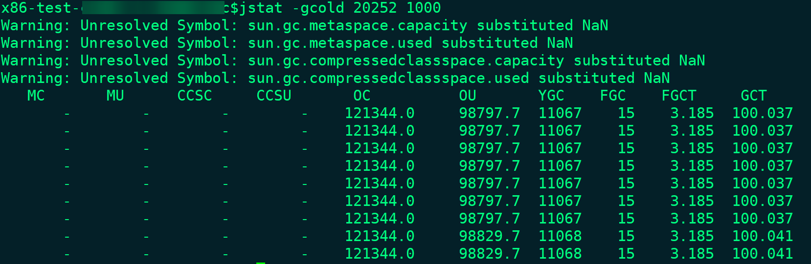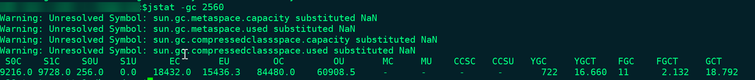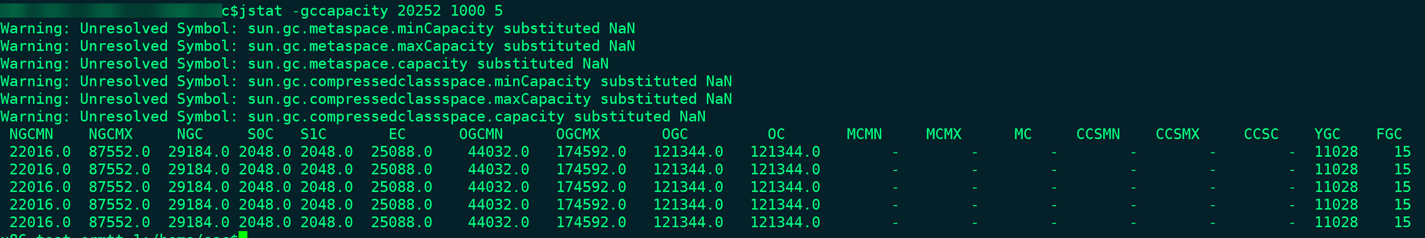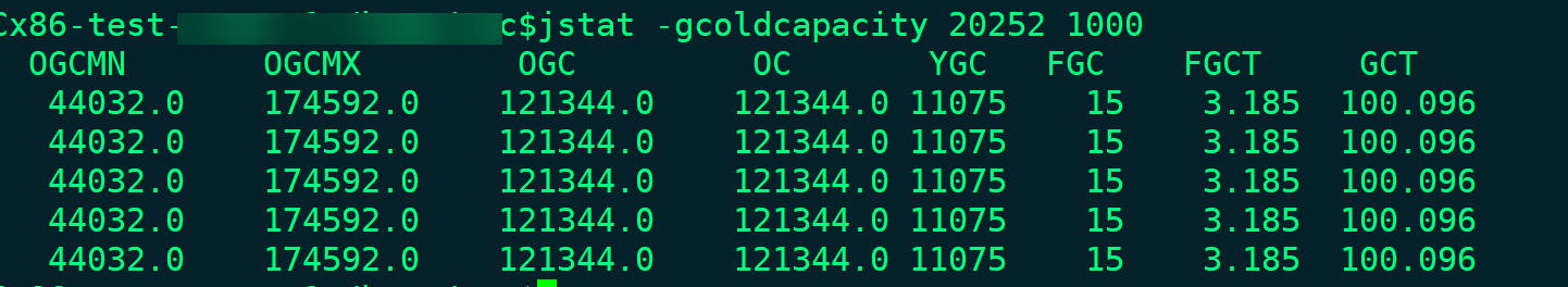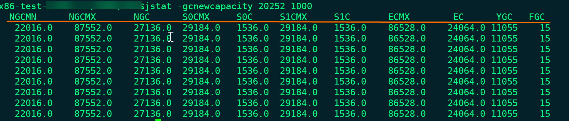 -gccapacity命令主要用来分析堆内存,用法参考上面,如下效果,表头含义参看上面