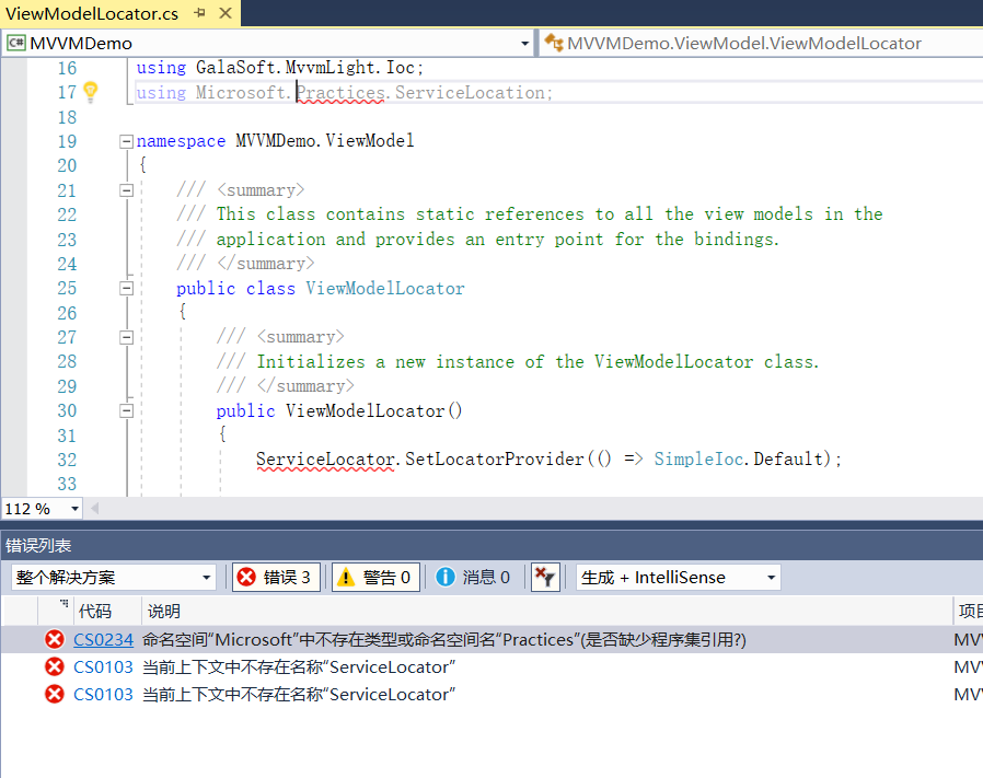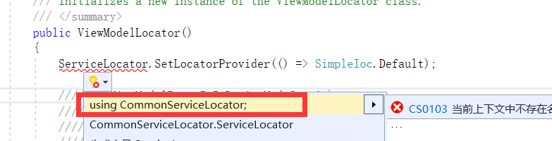然后使用Ctrl + . 给 ServiceLocator.SetLocatorProvider(() => SimpleIoc.Default); 重新引用命名空间,即可解决问题