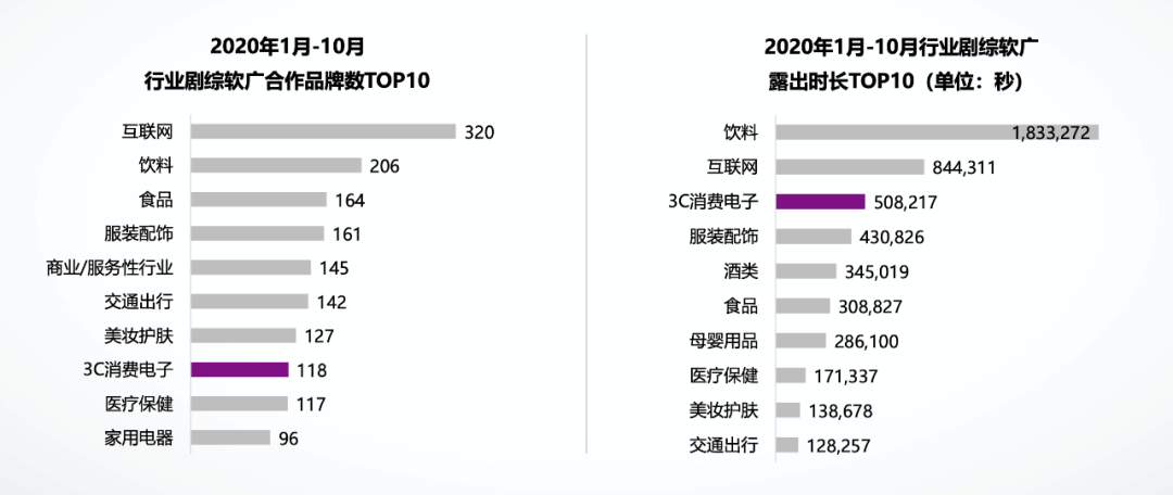2020年前10月,共计超过118个3C品牌在国产剧综中有各类不同形式的软广合作,其中品牌合作数量排名第八,露出时长排名第三,可以看出,3C类品牌平均曝光时长较高。
