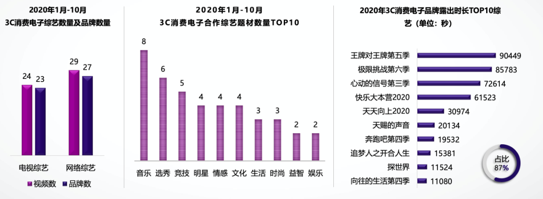 2020年前10月3C软广曝光时长TOP10综艺中,老牌综艺、综N代占七成,10部综艺曝光时长占前10月3C品牌综艺总曝光时长的87%,3C综艺软广投放集中度高。
