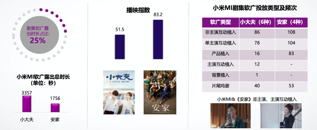 合作的两部剧集中,《安家》在2020年1月-10月上线的国产剧集中播映指数排名第二,《小大夫》播映指数略低。剧集软广类型主要以非主演、单主演互动植入为主。