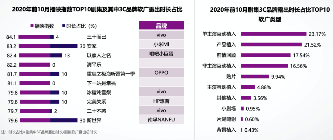2020年1月-10月剧集3C品牌软广类型露出时长TOP10中,单主演互动植入、产品植入品牌露出时长占比均超20%。