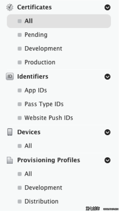 上面的列表就包含了开发、调试和发布iOS应用程序所需的所有内容:Certificates、Identifiers、Devices、Provisioning Profiles。下面将一一解释这几个东东。