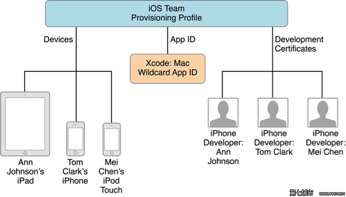 iOS Team Provisioning Profile是第一次使用Xcode添加设备时,Xcode自动生成的,它包含了Xcode生成的一个Wildcard App ID(*,匹配所有应用程序),账户里面所有的Devices和所有Development Certificates,如下图所示。因此,team中的所有成员都可以使用这个iOS Team Provisioning Profile在team中的所有设备上调试所有的应用程序。并且当有新设备添加进来时,Xcode会更新这个文件。