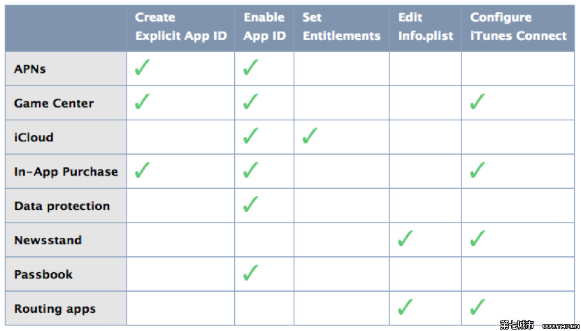 每创建一个App ID,我们都可以设置该App ID所使用的APP Services,也就是其所使用的额外服务。每种额外服务都有着不同的要求,例如,如果要使用Apple Push Notification Services,则必须是一个explicit App ID,以便能唯一标识一个应用程序。下面是目前所有可选的服务和相应的配置要求。