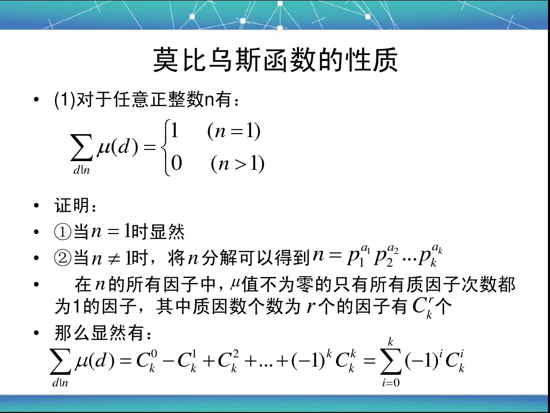 6、莫比乌斯反演:对于函数f(n)和F(n),若$F(n)=\sum_{d|n}f(d)$,那么$f(n)=\sum_{d|n}\mu (d)F(\frac{n}{d})$。