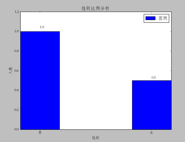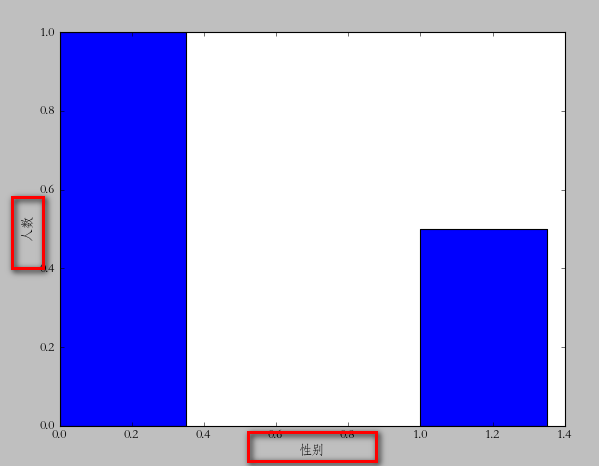 注意这里的中文一定要用u(3.0以上好像不用,我用的2.7),因为matplotlib只支持unicode。接下来,让我们在x轴上的每个bar进行说明。比如第一个是“男”,第二个是“女”。